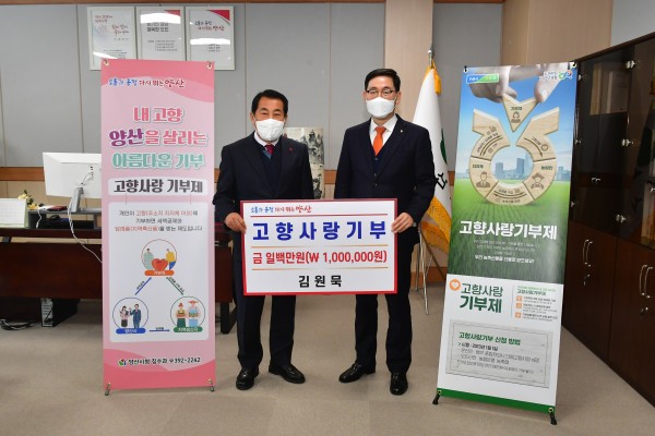 기부자는 농협중앙회 양산시지부 김원묵 지부장으로 양산시에 고향사랑기부제 1호 기부자로 100만원을 기부했다.