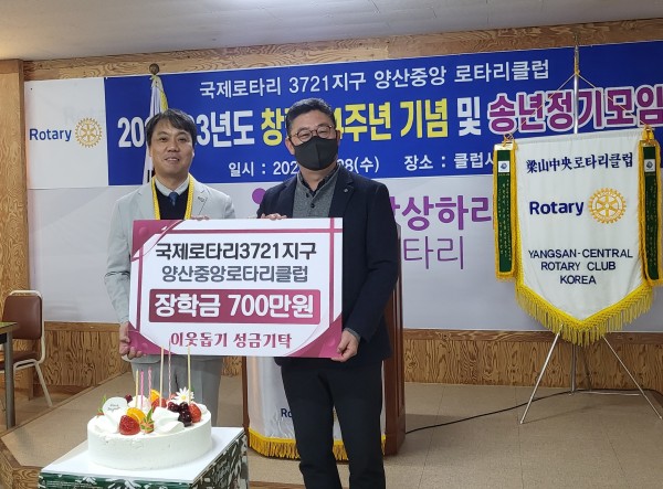 국제로타리 3721지구 양산중앙로타리클럽(회장 한윤구)에서는 지난 28일 양산중앙로타리클럽의 연말 총회를 개최하면서 양산시에 청소년 희망장학금 700만원을 전달했다.