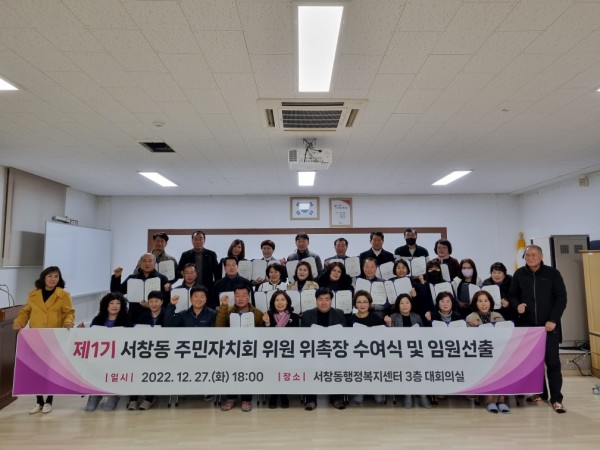 서창동은 지난 27일 서창동행정복지센터 대회의실에서 제1기 주민자치회 위원 위촉식을 개최하고 주민자치회 회장, 부회장, 감사 2명의 임원진을 선출하였다.
