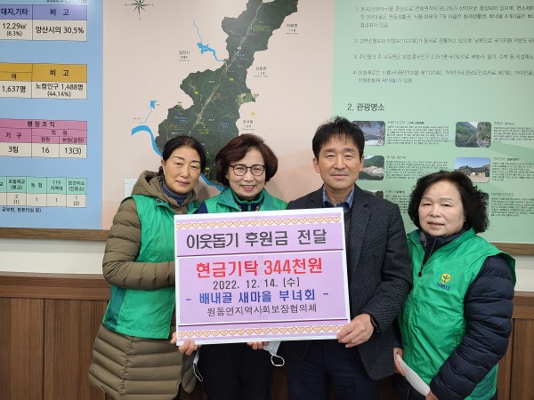 양산시 원동면 배내골 새마을부녀회는 지난 11월 양산배내사과축제 다과부스 운영 수익금 34만4천원을 어려운 이웃을 위해 써달라며 기탁했다.
