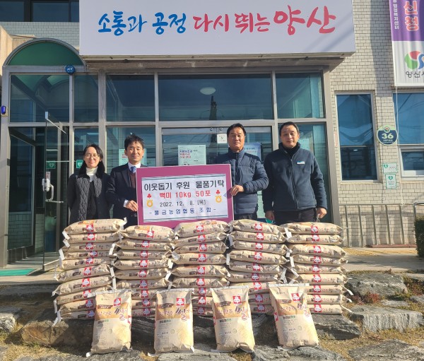 양산 물금농협에서 어려운 이웃을 돕기 위해 원동면에 백미 10kg 50포를 기탁했다.