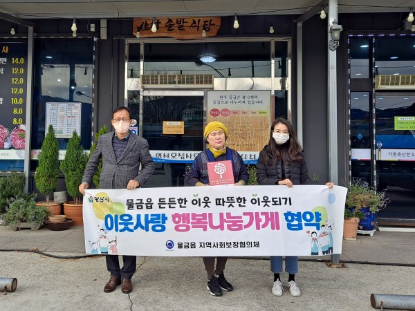 이번 「행복나눔가게」에 참여한 가촌솔밭식당은 결식우려가 있는 돌봄이웃 5세대에게 매월 밑반찬을 지원하기로 했으며 김정출 대표는 “지역사회 나눔에 조금이나마 동참하여 주변의 소외된 이웃들에게 사랑을 전할 수 있어서 행복하다”고 말했다.