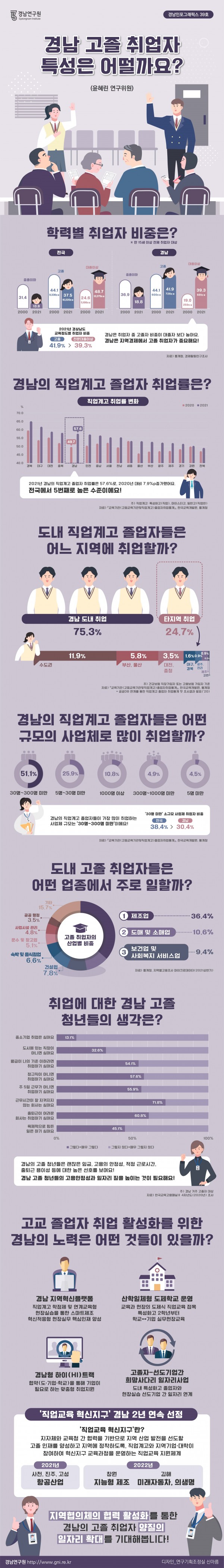 인포그래픽스를 작성한 윤혜린 연구위원은 경남지역 학력별 취업자 변화와 최근 경남지역 고졸 취업자의 특징을 살펴보고 고교졸업자 취업 활성화를 위한 경남도의 노력들을 소개했다.