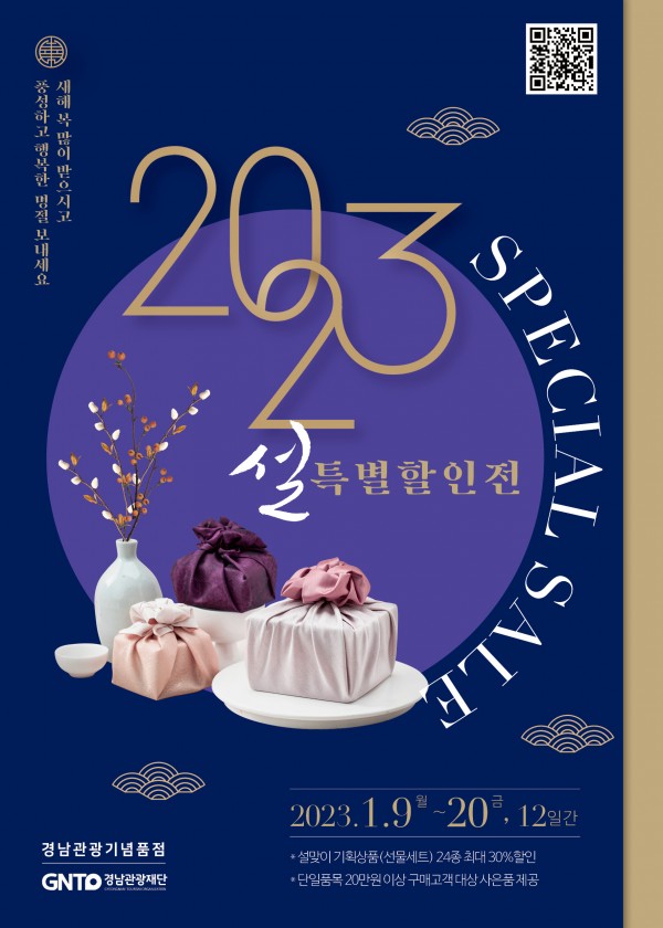 경상남도와 경남관광재단이 운영하는 경남관광기념품점(이하 기념품점)은 2023년 설을 맞이하여 1월 9일(월)부터 1월 20일(금)까지 특별 할인행사를 진행한다고 밝혔다.