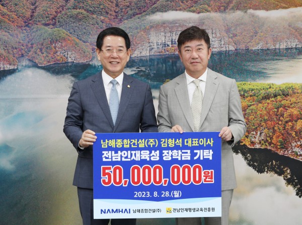 전라남도는 28일 남해종합건설과 에드가진도가 전남의 인재 육성을 위해 각각 5천만 원과 3천만 원의 장학금을 (재)전남인재평생교육진흥원에 기탁했다고 밝혔다.