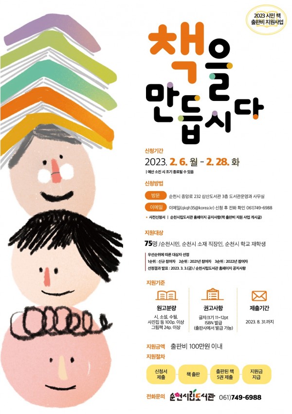 순천시(시장 노관규)는 시민들의 책 쓰기 문화 조성을 위해 책 출판비 일부를 지원하는 ‘시민 책 출판비 지원 사업’을 6일부터 운영한다.
