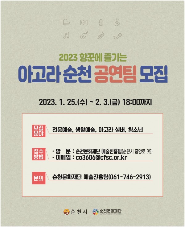 자세한 내용은 순천문화재단 누리집(www.cfsc.or.kr) 공지사항을 확인하거나 예술진흥팀(061-746-2913)으로 문의하면 된다.