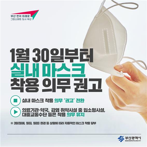 부산시(시장 박형준)는 오는 1월 30일부터 마스크 착용 의무화 행정명령을 변경 발령하고, 실내마스크 착용을 ‘의무’에서 ‘권고’로 전환한다고 밝혔다.