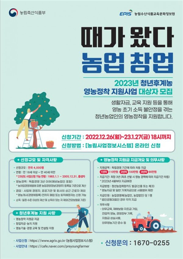 자세한 내용은 농식품부 누리집(https://www.mafra.go.kr) 및 농림수산식품교육문화정보원 누리집(www.epis.or.kr)에서 확인할 수 있으며 청년농업인 안내 전화(☎1670-0255)로 문의해도 된다.