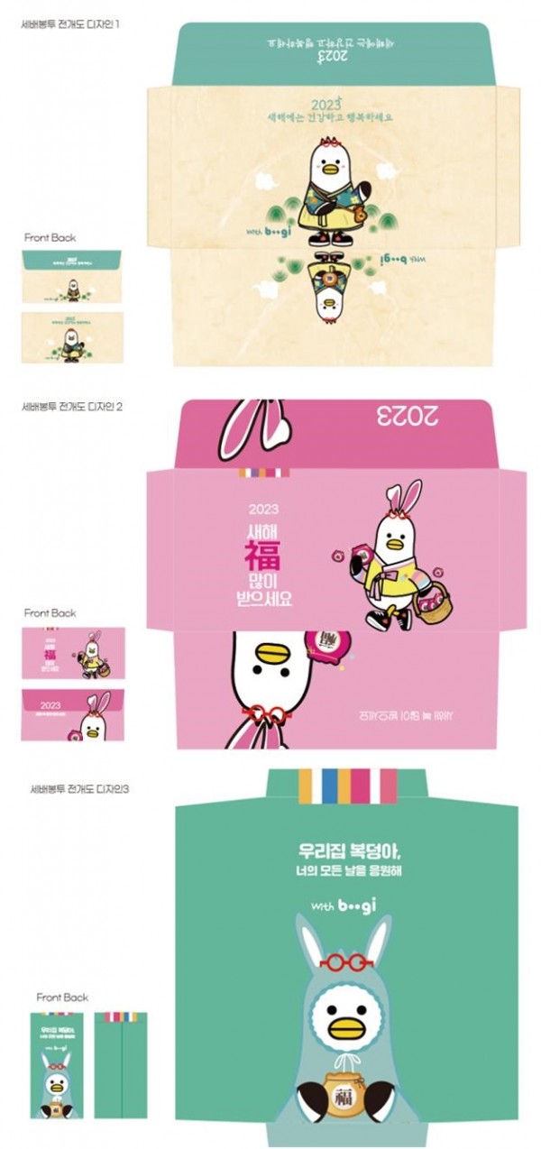 봉투 종류별로 ‘부기’가 한복을 입거나 토끼 머리띠를 쓰고, 각각 ‘새해 복 많이 받으세요’, ‘새해에는 건강하고 행복하세요’, ‘우리집 복덩아, 너의 모든 날을 응원해’라는 새해 인사를 하고 있다.